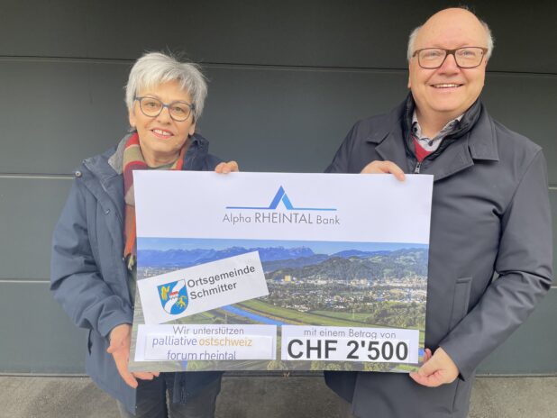 Anlässlich des Christbaumverkaufes 2025 spendeten die Besucherinnen und Besucher einen namhaften Betrag. Bruno Spirig, Präsident der Ortgemeinde Schmitter durfte Irma Looser, Leiterin Palliative Care, Forum Rheintal den Betrag von CHF 2’500.00 im Namen Aller überreichen.
